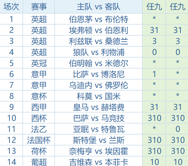 双选:伯恩茅斯31、埃弗顿31、乌迪内斯30、亚眠10、奈梅亨10