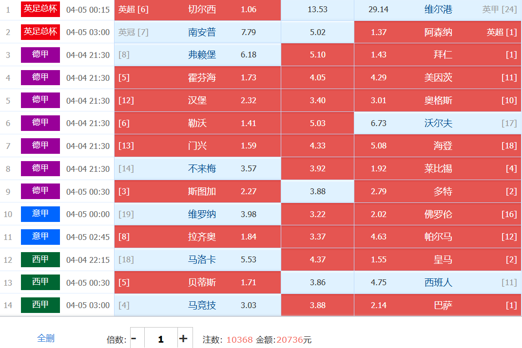 20736元14场初始单如下:今日14场质量很高,值得加大投入!